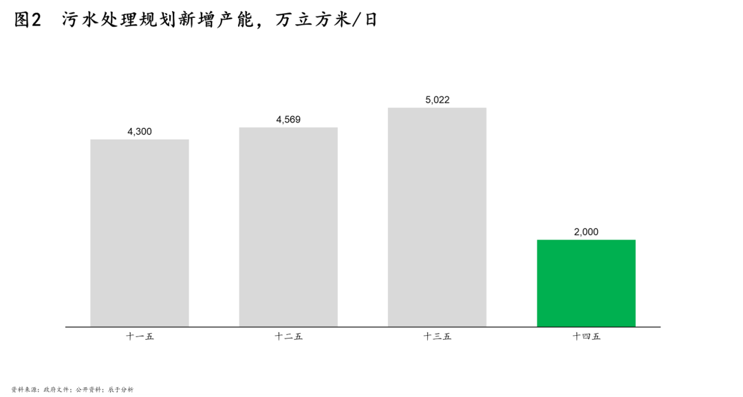 一是污水處理日漸成熟。近年我國(guó)城鎮(zhèn)污水處理任務(wù)已基本完成,城市污水處理率已經(jīng)達(dá)到95%以上,在“十四五”規(guī)劃中的污水處理新增產(chǎn)能也出現(xiàn)明顯下降(見(jiàn)圖2)。在污水處理漸趨飽和的情況下,先前遭到忽視的污泥處理問(wèn)題重新得到關(guān)注。