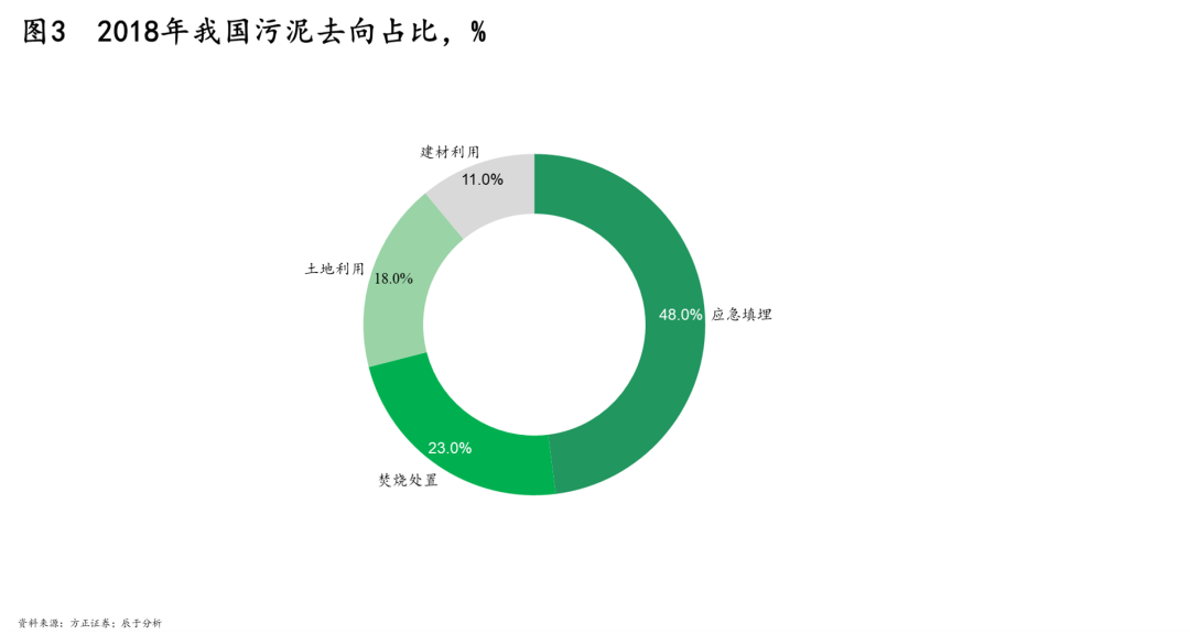 在這樣的條件下,大部分地區(qū)對(duì)污泥處理以最便利的填埋為主。以2018年為例,我國(guó)污泥去向近半成為應(yīng)急填埋(見(jiàn)圖3),盡管填埋并非最合適的污泥處理方式:占用土地面積大,場(chǎng)地不宜尋找;往往治標(biāo)不治本,因污泥含有重金屬及病菌,遇水極易造成二次污染,包括有害成分滲漏造成地下水污染、污泥中的營(yíng)養(yǎng)物質(zhì)使大量病原菌滋生繁衍等。