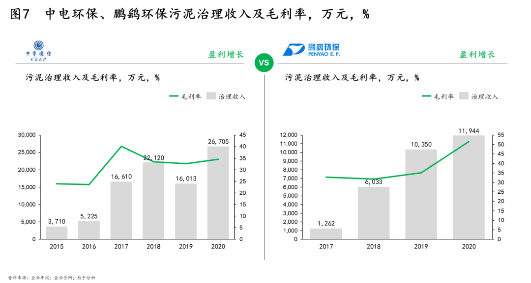 即便如此,我們也看到了部分盈利表現(xiàn)優(yōu)良的企業(yè),如中電環(huán)保和鵬鷂環(huán)保,兩者的污泥處理營(yíng)收和毛利率在近年來(lái)均呈現(xiàn)不同程度的增長(zhǎng)(見(jiàn)圖7)。