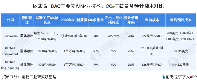 目前,全球有30余家初創(chuàng)公司、科研機(jī)構(gòu)、研發(fā)聯(lián)合體正在對(duì)DAC技術(shù)進(jìn)行研究,初創(chuàng)公司建立了19個(gè)試驗(yàn)場(chǎng)為研究提供試驗(yàn)數(shù)據(jù),修正研發(fā)方向。其中Climeworks公司、Global Thermostat公司、Carbon Engineering公司擁有自己的試驗(yàn)場(chǎng),已經(jīng)初步商業(yè)化。Carbon Engineering公司吸附劑類型為液體吸附,Climeworks和Global Thermostat為固體吸附劑。3家初創(chuàng)企業(yè)CO?捕獲量及預(yù)計(jì)成本如下: