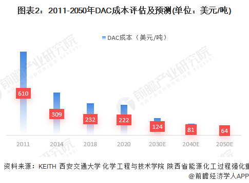 DAC技術(shù)2011年平均捕獲成本在610-780美元/噸二氧化碳,2020年平均捕獲成本為222-463美元/噸二氧化碳。隨著2020年代的商業(yè)化以及2040年代和2050年代的大規(guī)模實(shí)施,DAC系統(tǒng)的成本可能會(huì)大幅降低。