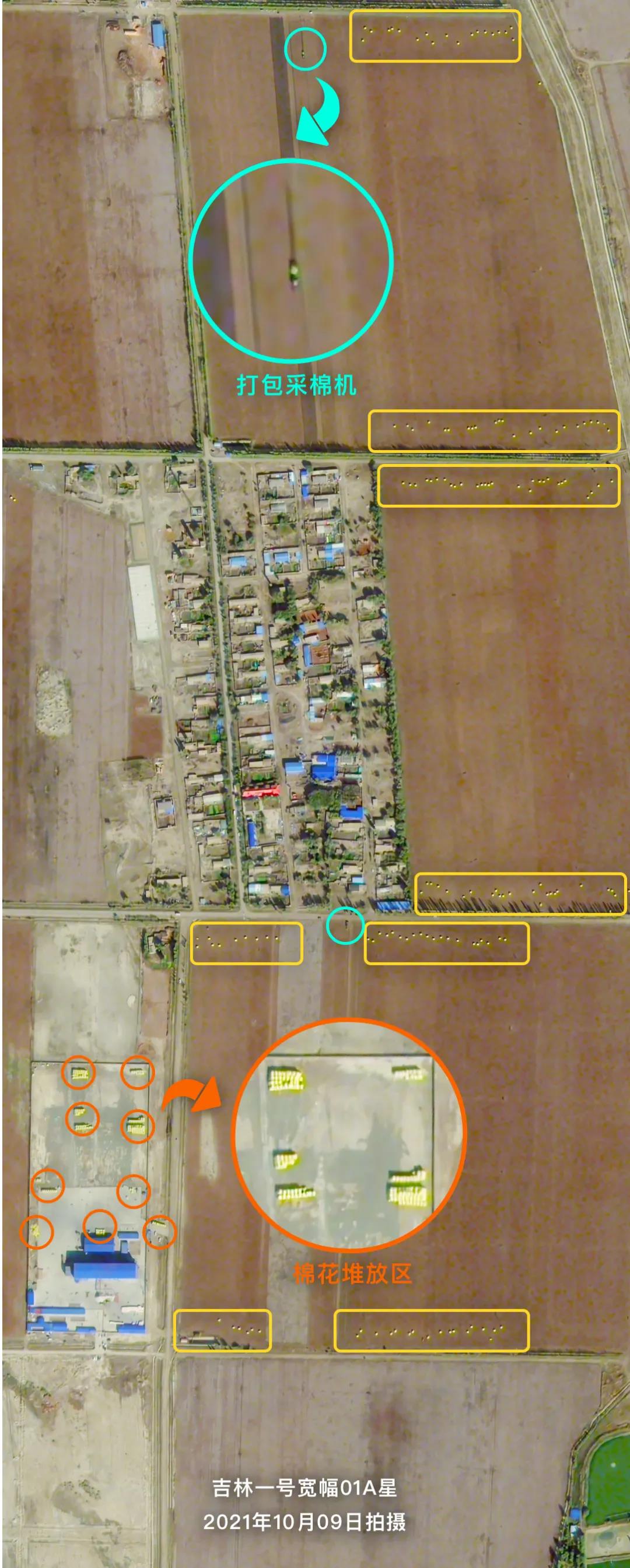 金秋時(shí)節(jié),新疆各地棉花陸續(xù)進(jìn)入采收期。吉林一號(hào)衛(wèi)星從太空記錄下了新疆昌吉回族自治州阜康市機(jī)械化采收棉花的忙碌場景,壓縮打包完成的棉花卷堆積在棉田周圍,正在等待運(yùn)輸。