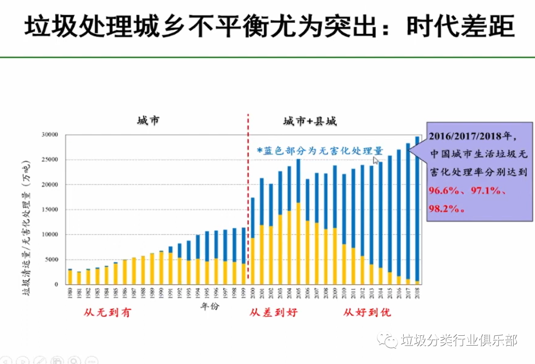 當(dāng)前城市的垃圾處理基本問題已解決,現(xiàn)在要在分類的新的理念引領(lǐng)下,我們向著可以構(gòu)建新型模式,但是我們大的無害化處理這些問題已基本得到解決。2018年垃圾的垃圾無害化處理已經(jīng)達(dá)到了98.2%,而農(nóng)村連基本數(shù)據(jù)都沒有,農(nóng)村的數(shù)據(jù)很多都是估計(jì)的?,F(xiàn)代化的管理是數(shù)字化的管理、信息化的管理,沒有數(shù)字就表明對它是沒有管理。底數(shù)不清,說明對它的管理薄弱。