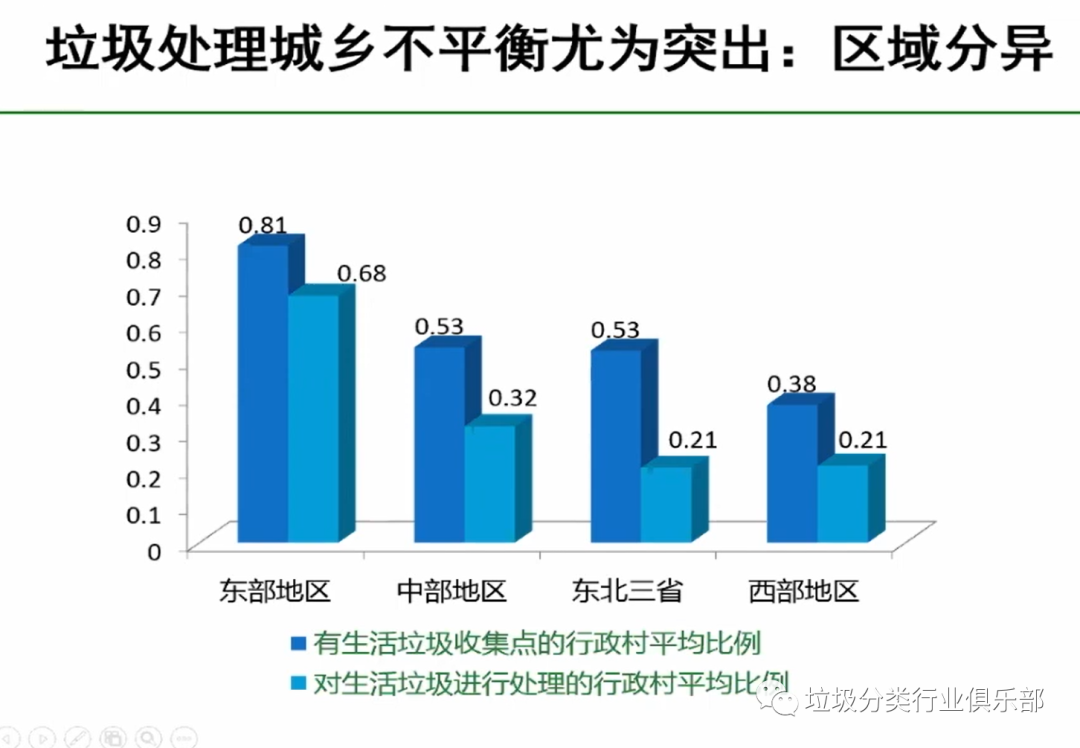 垃圾處理方面,區(qū)域差異性比較大。經(jīng)濟(jì)比較發(fā)達(dá)的東部地區(qū)、其次是中部略微要好些。東部很多地方都已經(jīng)通過城鄉(xiāng)一體化的管理以及垃圾的處理,基本上有了一些保障,但是東北、西部依然看到有生活垃圾收集點(diǎn)的行政村比例都很低,處理的就更低了。