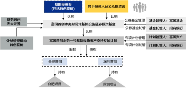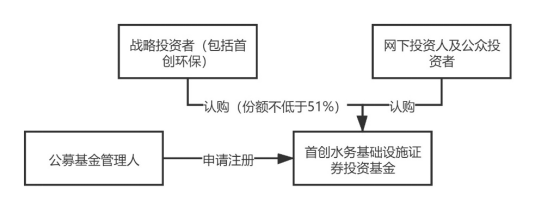 具體實(shí)施步驟為:首先,公募基金管理人富國(guó)基金向證監(jiān)會(huì)申請(qǐng)注冊(cè)首創(chuàng)水務(wù)基礎(chǔ)設(shè)施證券投資基金,取得注冊(cè)文件后,富國(guó)基金將基礎(chǔ)設(shè)施證券投資基金進(jìn)行公開(kāi)發(fā)售,其中首創(chuàng)環(huán)保或其同一控制下關(guān)聯(lián)方作為戰(zhàn)略配售投資人參與認(rèn)購(gòu)比例不低于本次基金份額發(fā)售數(shù)量的51%(實(shí)際發(fā)行時(shí)認(rèn)購(gòu)比例為51%)。