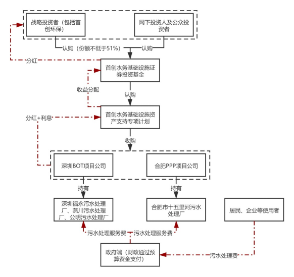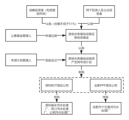 再次,專項(xiàng)計(jì)劃設(shè)立后,通過(guò)與原始權(quán)益人首創(chuàng)環(huán)保簽署《股權(quán)轉(zhuǎn)讓協(xié)議》收購(gòu)深圳、合肥項(xiàng)目公司全部股權(quán)。首創(chuàng)水務(wù)基礎(chǔ)設(shè)施證券投資基金通過(guò)專項(xiàng)計(jì)劃及項(xiàng)目公司股權(quán)穿透取得4個(gè)污水處理廠項(xiàng)目完全所有權(quán)。