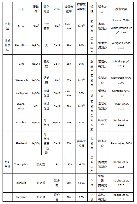 熱化學(xué)法是在900~2000 ℃高溫下,將重金屬及其化合物氣化(或液化),通過氣相分離(或密度分離)裝置實現(xiàn)重金屬與磷的分離。因此,熱化學(xué)法借助于高溫環(huán)境,可同時實現(xiàn)磷提取與磷純化。另外,高溫環(huán)境通過打破灰分中原有礦物相,形成新的磷酸鹽礦物相(Ca-P) 繼而提高了磷酸鹽的可植物利用度。目前,具有代表性的熱化學(xué)法有Thermphos、AshDec和Mephrec工藝。各個方法的比較如下表所示。