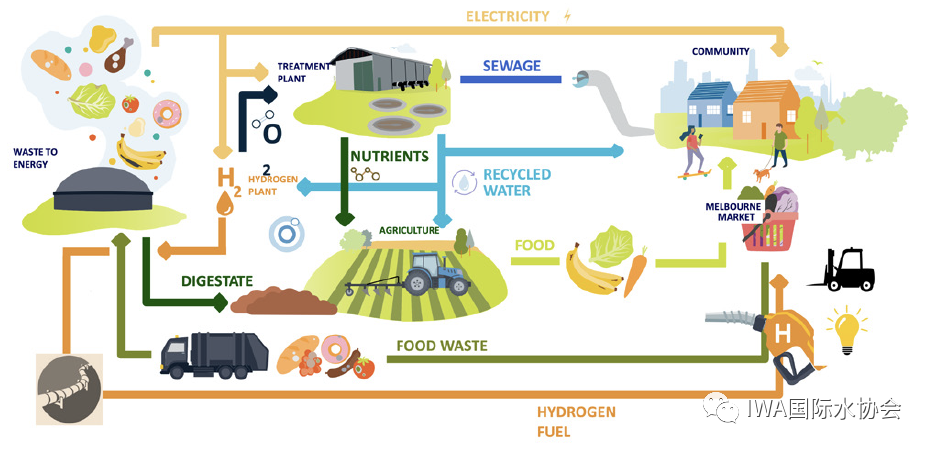 第二個(gè)例子是墨爾本的亞拉河谷水務(wù)公司(Yarra Valley Water)。他們成功召集了一個(gè)團(tuán)隊(duì)在墨爾本北郊的Aurora污水廠開展一個(gè)制氫項(xiàng)目。該團(tuán)隊(duì)除了水務(wù)公司,還有希望實(shí)現(xiàn)碳減排的租戶、希望擴(kuò)大制氫設(shè)備規(guī)模的技術(shù)供應(yīng)商,以及尋求去碳化的供氣公司。項(xiàng)目的水源是污水廠多余的再生水,以及附近一個(gè)垃圾發(fā)電廠的剩余可再生能源。