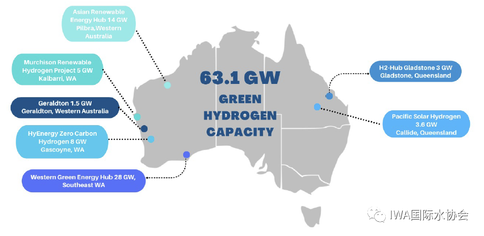 如下圖所示,澳洲計(jì)劃在東西海岸打造7個(gè)吉瓦級(GWh)的綠氫項(xiàng)目。此外,各地的污水廠已經(jīng)有實(shí)際的項(xiàng)目在測試或運(yùn)行中。