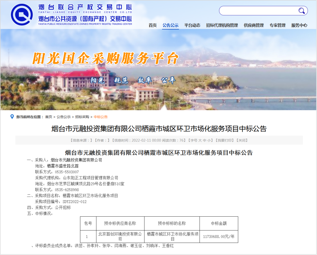 煙臺市公共資源(國有產(chǎn)權(quán))交易中心消息,2022年2月11日,煙臺市元融投資集團(tuán)有限公司棲霞市城區(qū)環(huán)衛(wèi)市場化服務(wù)項(xiàng)目開標(biāo),中標(biāo)結(jié)果如下: