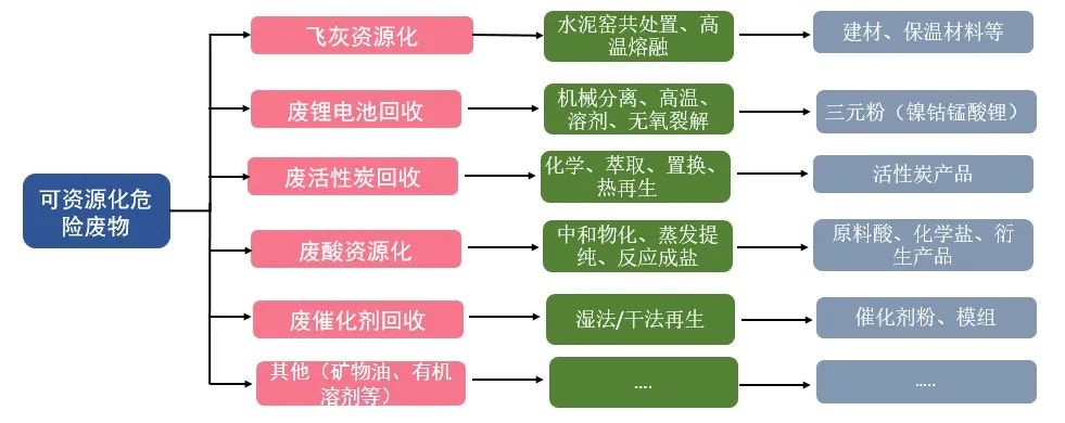 盡管無害化處置取得了長足的發(fā)展,但從長遠(yuǎn)看仍然面臨填埋庫容占用、焚燒二次污染控制難、回收不徹底等問題。針對(duì)物性簡(jiǎn)單、產(chǎn)生量大、有回收利用價(jià)值的危廢,應(yīng)優(yōu)先考慮資源化利用。綜合分析市場(chǎng)需求及行業(yè)內(nèi)當(dāng)前熱門資源化利用方向,當(dāng)前聚焦較多的資源化利用技術(shù)主要包括焚燒灰渣利用、廢鋰電池回收、廢活性炭再生、廢酸資源化、廢催化劑再生、污泥貴金屬回收、廢有機(jī)溶劑回收等。