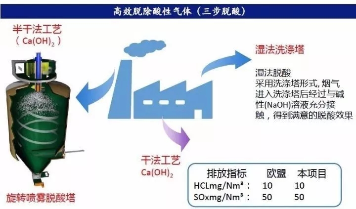 產(chǎn)生的高溫?zé)煔饨?jīng)過(guò)余熱鍋爐回收熱量,產(chǎn)生的蒸汽經(jīng)過(guò)汽輪機(jī)發(fā)電機(jī)組發(fā)電。煙氣凈化系統(tǒng)則是整個(gè)項(xiàng)目最大的亮點(diǎn),在國(guó)內(nèi)常用的“五步處理法”基礎(chǔ)之上加以改進(jìn),三步脫酸、兩步除塵、兩步脫硝,是國(guó)內(nèi)唯一一家采用如此復(fù)雜工藝流程的在運(yùn)行項(xiàng)目。