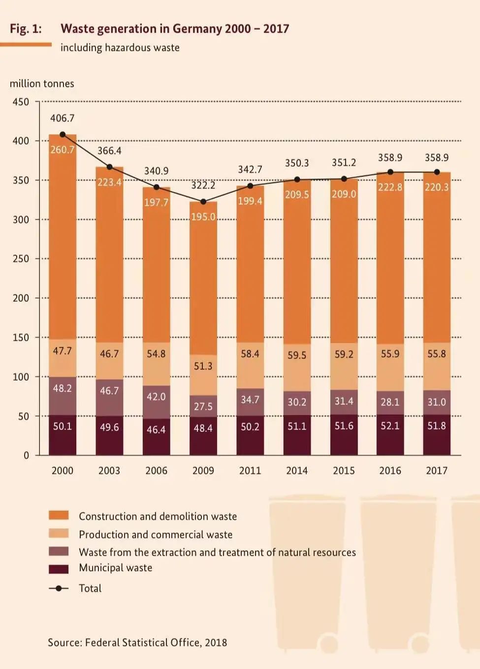 在德國,廢棄物管理和循環(huán)經濟對氣候行動最重要的貢獻在于禁止對未經處理的可生物降解廢棄物進行填埋。自2005年起禁止填埋可生物降解的廢棄物,因此填埋的溫室氣體排放量與1990年相比下降了約77%。1990年以來,廢棄物管理領域的年排放量已通過這種方式減少了6500萬噸CO2e。