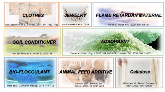 污水資源化是未來污水處理的發(fā)展方向,也是人類可持續(xù)發(fā)展的必然。自污水或污泥中提取的多糖、蛋白質、腐殖質、核酸、DNA、磷脂、糖醛酸和礦物質等,可作為印染原料、首飾和服裝原料、阻燃材料、土壤調節(jié)劑、吸附劑、生物絮凝劑、飼料添加劑,應用于水處理、農(nóng)業(yè)、園藝、造紙工業(yè)、醫(yī)療、建筑工業(yè)等領域,具有重大的回收價值。