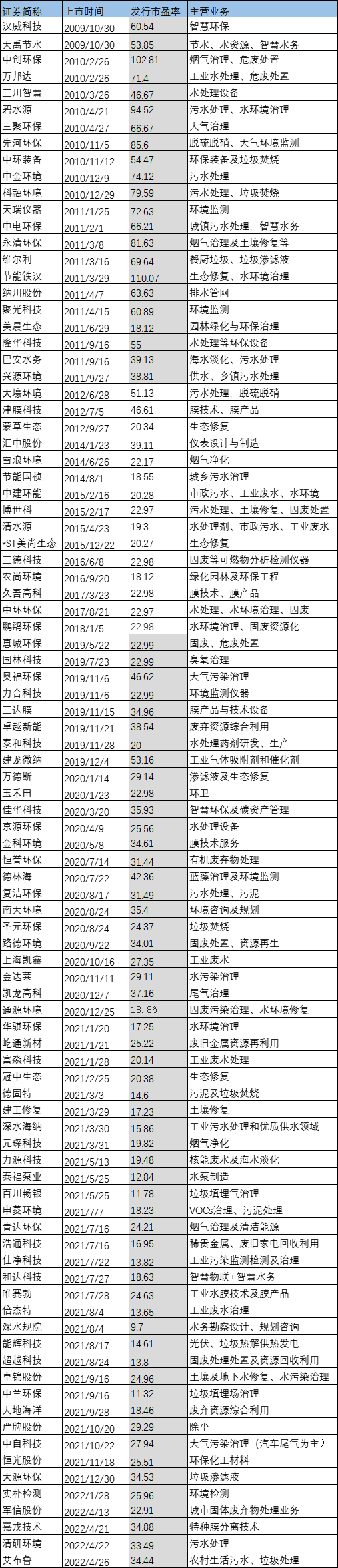 市盈率亦稱本益比,是股票價格除以每股盈利的比率。發(fā)行市盈率是指企業(yè)上市時股票發(fā)行價格與股票的每股收益的比例,可以用來反映資本對企業(yè)的價值判斷。一定程度上等同于大家俗稱的上市公司的PE值。發(fā)行市盈率高,在一定程度上反映了投資者對公司當(dāng)前價值和發(fā)展?jié)摿Φ恼J(rèn)同。這里作者試著從發(fā)行市盈率角度,看看這些年資本對環(huán)保企業(yè)的態(tài)度變化。