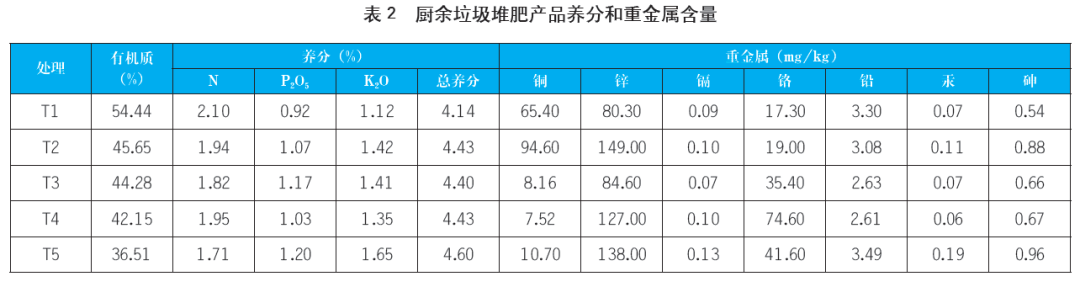 表2為各處理廚余垃圾堆肥產(chǎn)品的有機質(zhì)、養(yǎng)分和重金屬含量。在堆肥過程中,各處理有機質(zhì)含量不斷下降,但均滿足《有機肥料》(NY/T 525-2021)標準(有機質(zhì)含量≥30%)。由于有機物礦化會導致堆體體重減輕發(fā)生濃縮效應,總養(yǎng)分(以N+P2O5+K2O計)含量增加,各處理含量均>4.0%,具有較高的營養(yǎng)價值。對于各處理重金屬含量,鋅的含量最高(80.30~149.00mg/kg),其次為銅和鉻(7.52~94.60mg/kg和17.30~74.60mg/kg),再者是鉛(2.61~3.49mg/kg),鎘、汞、砷的含量保持在較低范圍(0.070~0.125mg/kg、0.061~0.187mg/kg和0.538~0.964mg/kg),遠低于《有機肥料》(NY/T 525-2021)中重金屬濃度標準。