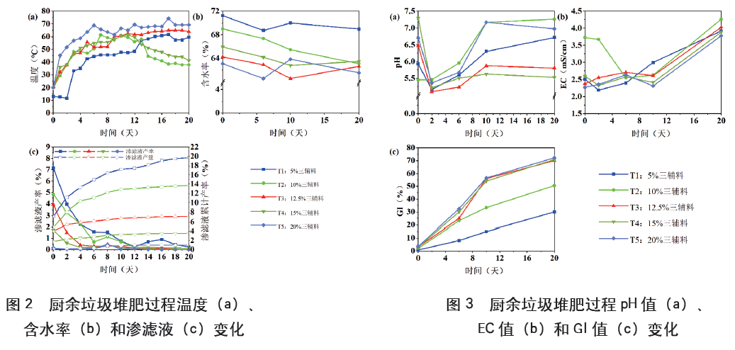 整體看來,各處理含水率呈不斷下降趨勢,而其他各處理含水率均低于5%三輔料處理(圖2b)。到堆肥結(jié)束時,添加12.5%和20%三輔料的處理含水率最低,分別為62.62%和61.54%;5%三輔料處理含水率為68.97%。堆肥開始時,隨著輔料配比的升高,滲濾液產(chǎn)率逐漸降低,5%三輔料和20%三輔料處理差異顯著,初始產(chǎn)率分別為7.2%和0.1%(圖2c)。當輔料添加比例由5%增至12.5%時,滲濾液累計產(chǎn)率由19.7%降至7.2%;當輔料添加比例增至20%時,滲濾液累計產(chǎn)率為1.0%。由此可見,當輔料施用比例大于12.5%時,可以顯著減少由廚余垃圾的高含水率產(chǎn)生的大量滲濾液。