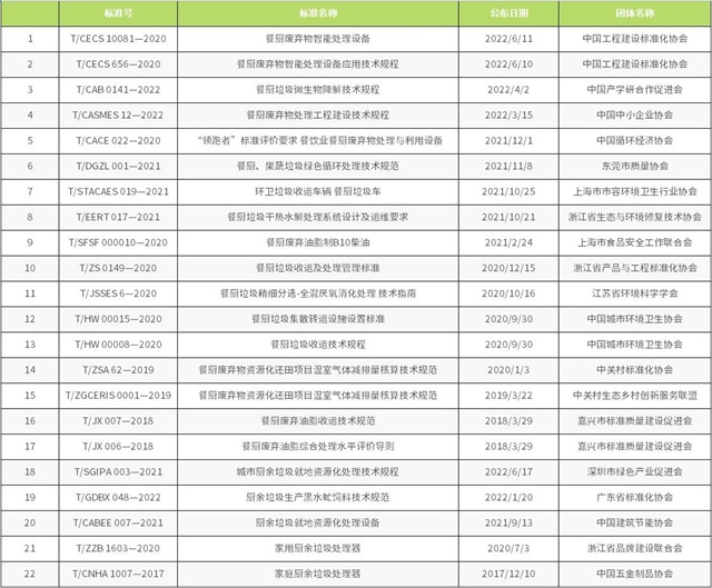 截至目前,已備案的餐廚垃圾相關(guān)標(biāo)準(zhǔn)有《餐廚垃圾車》QC/T 935-2013、《餐廚棄物處理機》JB/T 12342-2015、《餐廚廢棄物油水自動分離設(shè)備》CJ/T 478-2015、《餐廚垃圾自動分選系統(tǒng) 技術(shù)條件》JB/T 13166-2017、《餐廚廢棄物生產(chǎn)肥料中生物腐植酸含量測定方法》HG/T 5603-2019和《土壤調(diào)理劑及使用規(guī)程 餐廚廢物原料》NY/T 3935-2021。