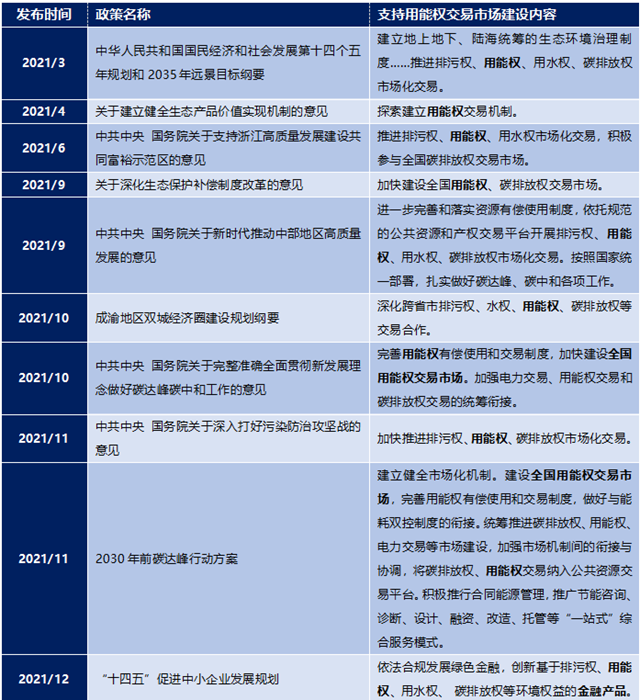 除《意見》外,2021年全年國家層面陸續(xù)發(fā)布多項政策,明確用能權(quán)交易機制建設(shè)在生態(tài)文明建設(shè)、碳達(dá)峰碳中和目標(biāo)、生態(tài)環(huán)境治理、綠色金融、小微企業(yè)支持及推動我國中部地區(qū)和成渝雙城經(jīng)濟圈等局部地區(qū)高質(zhì)量發(fā)展過程中的重要地位。