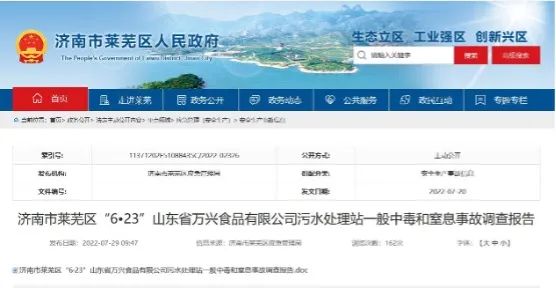 并且前幾天,山東省濟南市萊蕪區(qū)公布了“6?23”山東省萬興食品有限公司污水處理站一般中毒和窒息事故調(diào)查報告。