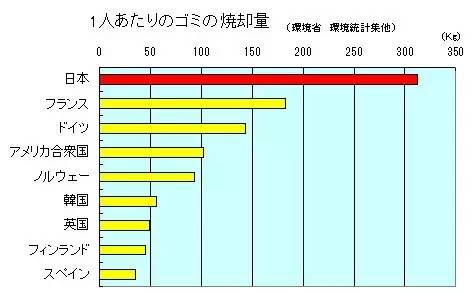 據(jù)日本環(huán)境省的數(shù)據(jù)表明,日本每人每年的垃圾排出量為320kg,日本的垃圾焚燒廠的數(shù)量也是高居世界首位(日本又1243座燃燒爐,相比之下,美國有351座,法國有188座,德國只有154座……)。