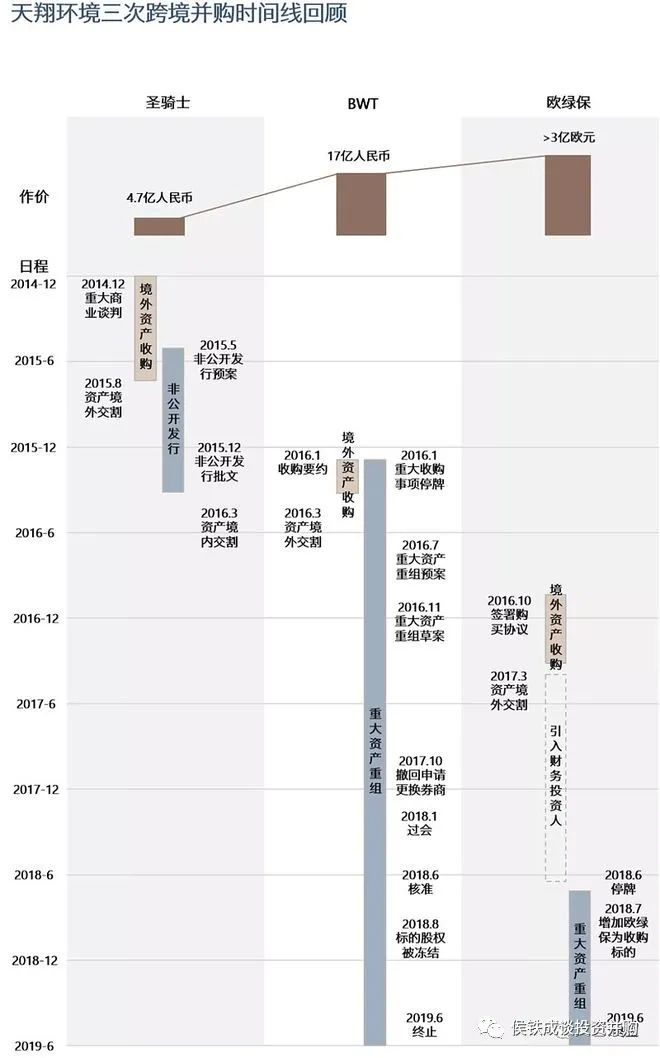 原本的十大并購(gòu)案例,寫著寫著寫成了十大環(huán)保并購(gòu)慘案。為了緩解大家失落悵惘的心情,免費(fèi)奉上一個(gè)跌到谷底的案子,大家再忍一忍,黎明前的黑暗。本文為環(huán)保十大并購(gòu)案例之五,天翔環(huán)境海外收購(gòu)圣騎士、BWT、歐綠保,最終公司破產(chǎn)退市。我們之前看的幾個(gè)并購(gòu)失敗案例,雖然也都是十年苦心經(jīng)營(yíng),毀于一旦,但大部分只是元?dú)獯髠鳡I(yíng)業(yè)務(wù)利潤(rùn)虧光,大股東黯然離場(chǎng)而已。今天的案例,并購(gòu)的后果是上市公司破產(chǎn)退市,大股東債務(wù)纏身被檢查機(jī)關(guān)起訴,員工債權(quán)人均蒙受巨大損失。里里外外大幾十億的虧損,堪稱“環(huán)保上市公司十年內(nèi)最大的慘案”。歡迎大家多提寶貴意見。尋找底層規(guī)律,帶動(dòng)行業(yè)發(fā)展,避免低級(jí)錯(cuò)誤重現(xiàn)。幾經(jīng)掙扎的天翔環(huán)境最終還是在2021年8月30日迎來了被深交所摘牌的結(jié)局。天翔環(huán)境原名天保重裝,原主業(yè)為大型節(jié)能環(huán)保及清潔能源設(shè)備,具體包括分離機(jī)械系列設(shè)備和水輪發(fā)電機(jī)組設(shè)備,并于2014年完成上市。當(dāng)時(shí),天翔環(huán)境的主營(yíng)已露疲態(tài),上市當(dāng)年收入下滑超過30%,公司開始尋找轉(zhuǎn)型方向。2015年開始,天翔環(huán)境通過連續(xù)的大手筆并購(gòu)進(jìn)軍環(huán)保領(lǐng)域,先后以4.7億收購(gòu)美國(guó)的污泥處理設(shè)備公司圣騎士、17億收購(gòu)德國(guó)的水處理公司BWT,并在隨后迎來了自己的高光時(shí)刻,2016年底,其市值來到了107.5億的歷史最高值。好景不長(zhǎng),因?yàn)轶w外并購(gòu)未能裝入上市公司,導(dǎo)致了一系列問題,悲劇大幕就此拉開。2018年,天翔環(huán)境在年報(bào)中披露,控股股東直接控制的成都親華科技有限公司非經(jīng)營(yíng)性資金占用24.55億,而當(dāng)時(shí)天翔環(huán)境本身的債務(wù)逾期金額已達(dá)到17.58億。從此,天翔環(huán)境股價(jià)持續(xù)下跌,直至2021年8月30日最終被深交所摘牌。回顧天翔環(huán)境的發(fā)展歷程,核心是三次海外收購(gòu),分別是2014年12月收購(gòu)的美國(guó)圣騎士,2016年1月收購(gòu)的BWT公司,2016年10月收購(gòu)的歐綠保,交易金額預(yù)期超過3億歐元。其中第一個(gè)交易順利完成,后面兩個(gè)交易只完成了體外收購(gòu),并沒有完成裝入上市公司的動(dòng)作,最終也導(dǎo)致了上市公司與大股東的相繼崩盤。第一筆收購(gòu),公司與券商聯(lián)合成立基金,收購(gòu)標(biāo)的公司。然后上市公司非定向增發(fā),募集資金收購(gòu)基金持股。收購(gòu)與定增并行推進(jìn),加快交易節(jié)奏,順利地完成了交易。這個(gè)案子金額相對(duì)小,方案謹(jǐn)慎,交易結(jié)構(gòu)簡(jiǎn)單,資本市場(chǎng)當(dāng)時(shí)資金充足,因此完成相對(duì)容易些。企業(yè)由此嘗到了甜頭,默認(rèn)為其他項(xiàng)目也可以先收購(gòu),再定增裝入上市公司。2016年2月,僅僅在上市公司剛剛完成非公開發(fā)行一個(gè)月、圣騎士股權(quán)尚未完成交割之時(shí),天翔環(huán)境又再次啟動(dòng)了對(duì)更大的收購(gòu)標(biāo)的——估值達(dá)到2.2億歐元的德國(guó)水處理公司BWT。因?yàn)榻灰讜r(shí)間緊張,天翔和基金先籌集資金收購(gòu),然后再由大股東組建資金替代基金,大股東向其他人承諾兜底,最終由上市公司定增完成收購(gòu)。在當(dāng)時(shí)的背景下,是有很多基金愿意參與并購(gòu)定增,同時(shí)也默認(rèn)定增即可賺錢的邏輯,愿意參與這種有一定風(fēng)險(xiǎn)的投資。基金的收益在于定增后的股價(jià)增值,以及定增不成的大股東保底,風(fēng)險(xiǎn)在于定增后股價(jià)下跌,定增失敗后大股東無法保底。當(dāng)時(shí)環(huán)境下,基金方總體上還是認(rèn)為風(fēng)險(xiǎn)收益匹配的。這種情況跟當(dāng)時(shí)的熱錢有關(guān),即大部分資金來自信托,錢多無處可投。當(dāng)時(shí)的資金投資邏輯并不穩(wěn)定,是一種特殊情況。但第二筆收購(gòu)出現(xiàn)了問題,監(jiān)管機(jī)構(gòu)審核達(dá)2年之久。兩個(gè)原因,一個(gè)是券商的原因,一個(gè)是資金的來源問題。最終獲得批文的時(shí)間已經(jīng)是2018年6月。雪上加霜的是,公司在這筆交易尚未完成之際,大股東又組團(tuán)以3億歐元的價(jià)格收購(gòu)了更大的一家歐洲垃圾處理公司,同樣無法完成交易。這個(gè)時(shí)候大股東和上市公司都扛不住了,體外并購(gòu)的杠桿利息,疊加當(dāng)時(shí)嚴(yán)厲“去杠桿”的外部環(huán)境以及上市公司的PPP業(yè)務(wù)占用大量資金無法回收,跌跌不休的股價(jià)最終帶崩了大股東以及上市公司的債務(wù)崩盤。2018年8月,大股東企業(yè)親華科技持有中德天翔20.59%的股份被債權(quán)人凍結(jié),導(dǎo)致上市公司收購(gòu)中德天翔的交易無法完成交割。2019年1月24日上市公司公告收到證監(jiān)會(huì)立案調(diào)查通知書,此時(shí)天翔環(huán)境大股東因債務(wù)危機(jī)侵占上市公司資金已經(jīng)公開。2019年6月19日,天翔環(huán)境公告終止收購(gòu)中德天翔以及歐綠保的交易,大股東的過橋基金退出失敗,天翔環(huán)境開始自由解體。公司2021年年報(bào)披露,在2020年8月收到鄧