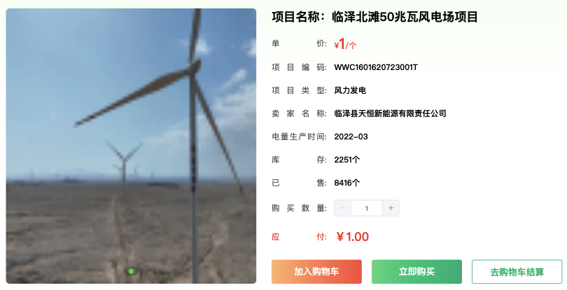 而這個標(biāo)價1元的風(fēng)電綠證,已售出8416個,庫存僅2251個。