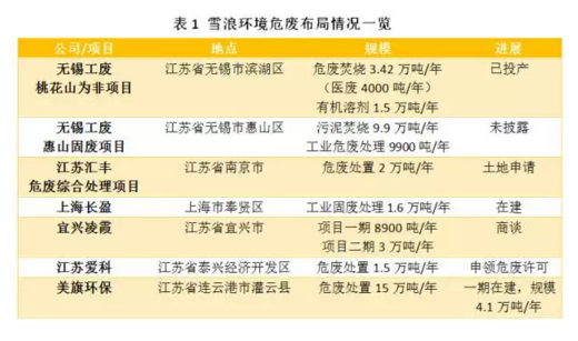 2016年11月,雪浪環(huán)境牽頭發(fā)起設(shè)立江蘇無(wú)錫雪浪金茂環(huán)保產(chǎn)業(yè)投資企業(yè)(有限合伙),基金總投資為5億元,雪浪環(huán)境通過設(shè)置企業(yè)并購(gòu)基金“無(wú)錫雪浪金茂”進(jìn)一步布局危廢市場(chǎng)。2017年7月,無(wú)錫雪浪金茂通過股權(quán)轉(zhuǎn)讓的形式收購(gòu)江蘇愛科65%的股權(quán)。2017年8月,無(wú)錫雪浪金茂通過股權(quán)轉(zhuǎn)讓的形式收購(gòu)美旗環(huán)保20%的股權(quán)。美旗環(huán)保擬投資建設(shè)灌云工業(yè)廢物綜合處理中心項(xiàng)目以處理灌云縣臨港產(chǎn)業(yè)區(qū)內(nèi)危廢為主,兼顧灌云、灌南、徐圩新區(qū)、響水等地危險(xiǎn)廢物綜合處理,總設(shè)計(jì)處理規(guī)模15萬(wàn)噸/年,其中工程一期處理規(guī)模4.1萬(wàn)噸/年。