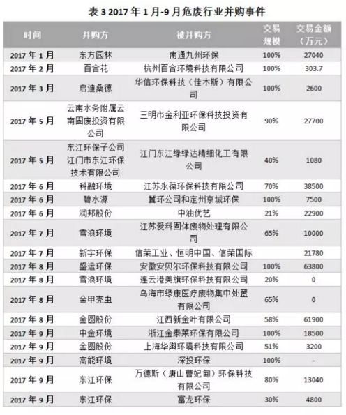 根據(jù)已有公開數(shù)據(jù)的不完全統(tǒng)計(jì),截至2017年9月,2017年危廢行業(yè)發(fā)起并購(gòu)行為19起起,累積交易金額32.46億元,并購(gòu)方既包括像東江環(huán)保、啟迪桑德、新宇環(huán)保這樣的“行業(yè)老兵”,也不乏碧水源、盛運(yùn)環(huán)保、中金環(huán)境等“后起之秀”,更有金圓股份等“跨界來(lái)者”。