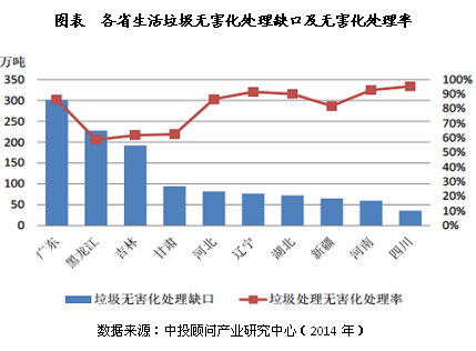 但個(gè)別地區(qū)生活垃圾無(wú)害化處理仍有缺口,主要是一些垃圾產(chǎn)生量基數(shù)較大的省份,如廣東省雖然無(wú)害化處理率已經(jīng)達(dá)到86%,但缺口仍有300萬(wàn)噸,以及垃圾處理發(fā)展較為緩慢的地區(qū),如黑龍江、吉林和甘肅三省無(wú)害化處理率都在60%左右,尚有較大的增長(zhǎng)空間。因此雖然垃圾的無(wú)害化處理在全國(guó)整體已接近飽和,但部分地區(qū)仍有快速擴(kuò)張的機(jī)會(huì)。