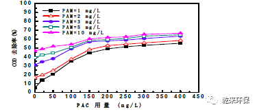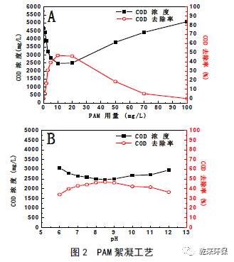絮凝性能。所以,PAC 和PAM 用量分別宜為150mg/L 和3mg/L , 此時COD 去除率為57% , COD 濃度為2,003mg/L。
