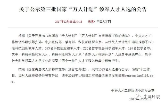 “萬人計劃”又名“國家高層次人才特殊支持計劃”,是一項面向國內(nèi)高層次人才的支持計劃。2012年國家“萬人計劃”啟動,目標(biāo)是用10年時間,遴選1萬名左右自然科學(xué)、工程技術(shù)和哲學(xué)社會科學(xué)領(lǐng)域的杰出人才、領(lǐng)軍人才和青年拔尖人才,給予特殊支持。其中,“萬人計劃”領(lǐng)軍人才計劃支持8000名國家科技發(fā)展和產(chǎn)業(yè)發(fā)展急需緊缺的創(chuàng)新創(chuàng)業(yè)人才,包括科技創(chuàng)新領(lǐng)軍人才、科技創(chuàng)業(yè)領(lǐng)軍人才、哲學(xué)社會科學(xué)領(lǐng)軍人才、教學(xué)名師和百千萬工程領(lǐng)軍人才等類別。第三批“萬人計劃”領(lǐng)軍人才共有1513名各領(lǐng)域?qū)<胰脒x,其中723名科技創(chuàng)新領(lǐng)軍人才、373名科技創(chuàng)業(yè)領(lǐng)軍人才、220名哲學(xué)社會科學(xué)領(lǐng)軍人才、197名教學(xué)名師人選。