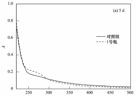堆肥過程中DOM的變化被認(rèn)為是能靈敏反映堆肥腐熟狀況的重要指標(biāo),與堆肥的固相組分相比更具代表性,因此本實(shí)驗(yàn)采用紫外-可見光譜共堆肥過程中DOM的光譜特征進(jìn)行了分析,而由前面的實(shí)驗(yàn)結(jié)果可知,1號瓶的整體堆肥效果最佳,因此將1號瓶中的堆體與對照組進(jìn)行了分析,結(jié)果如圖5所示。