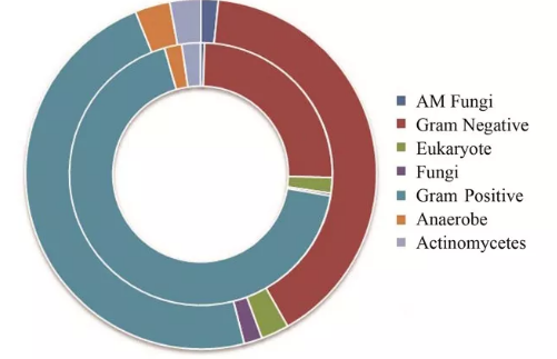 由圖7可知,在對照組與1號瓶中,均是細(xì)菌占主要地位,GramPositive(革蘭氏陽性菌)所占比例分別為67.9%和47.9%,而GramNegative(革蘭氏陰性菌)所占比例分別為24.9%和40.2%。投加中藥渣后,AMFungi(AM真菌)的比例由原來的0.49%增加到1.58%,F(xiàn)ungi(真菌)的比例由原來的0.31%增加到1.68%,由于真菌對堆體中的纖維素、半纖維素有著很好的降解作用,其菌絲具有機(jī)械穿插的作用,從而可促進(jìn)難降解的有機(jī)物的降解;同時Actinomycetes(放線菌)的比例由原來的2.30%增加到2.86%,放線性菌對木質(zhì)素的降解有著非常好的作用,可見,加入中藥渣對污泥堆肥結(jié)束時,堆體中的微生物種群變化有較大影響,從而也影響了蛋白酶活性及氨揮發(fā)情況。