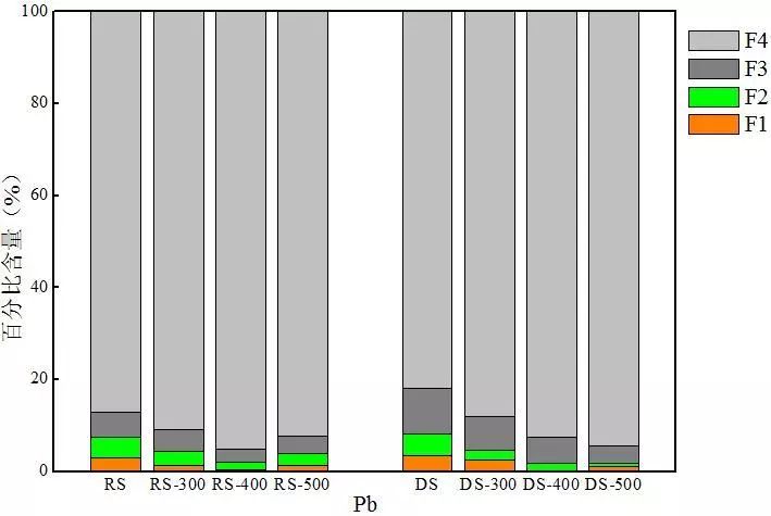 對比兩種熱解炭中Cr的分布可以發(fā)現(xiàn),消化污泥熱解炭中穩(wěn)定態(tài)Cr含量均高于同等溫度下生污泥熱解炭,尤其是F3態(tài)Cr的含量。以300 ℃熱解炭為例,RS-300和DS-300中F3態(tài)Cr的含量分別為35.4%和49.7%。這可能是因?yàn)樯勰嘀泻写罅康暮蚧衔?S含量達(dá)到1.97%),在厭氧環(huán)境下Cd更易形成硫化物,使消化污泥中F3態(tài)含量高于生污泥,從35.5%增加到53.5%,進(jìn)而導(dǎo)致消化污泥熱解炭中F3態(tài)Cr含量高于生污泥熱解炭。