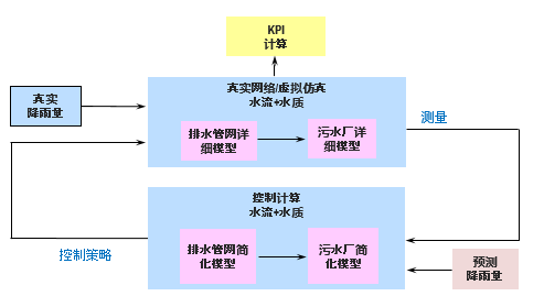 采用預(yù)測降雨量(約半小時之內(nèi)),結(jié)合水流、水質(zhì)簡化模型,管網(wǎng)優(yōu)化目標(biāo)以及物理約束等計(jì)算出一段采樣時間內(nèi)的最優(yōu)控制策略(主要針對水閥水泵)并賦給管網(wǎng)仿真系統(tǒng)或真實(shí)管網(wǎng)系統(tǒng),優(yōu)化控制軟件采用自主研發(fā)平臺MPCTool;