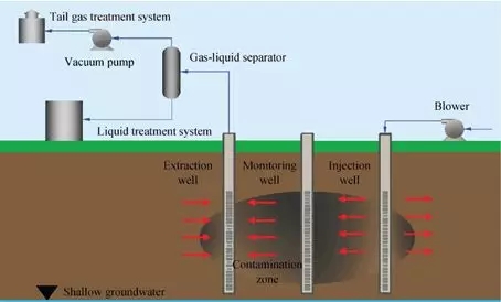 2.氣相抽提法:是去除非飽和區(qū)土壤中揮發(fā)性有機(jī)物的有效手段,通過注人井向滲流區(qū)注人空氣,同時利用抽提井產(chǎn)生低壓環(huán)境,使得土壤中存在于油相、溶解相以及吸附相的有機(jī)污染物揮發(fā)到氣相中,并經(jīng)抽提井收集到地面尾氣處理裝置中進(jìn)行回收或處理。