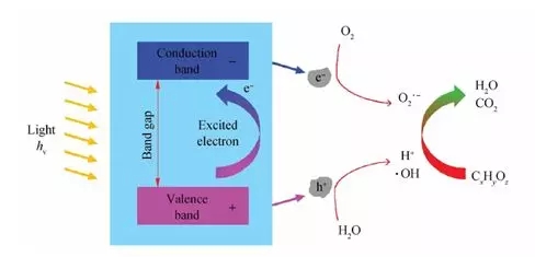 3. 光催化降解:是當(dāng)半導(dǎo)體材料吸收的光能大于或等于半導(dǎo)體禁帶寬度時,電子由半導(dǎo)體的價帶躍遷到導(dǎo)帶上產(chǎn)生高活性電子e 。同時,在原來的價帶上形成1 個 空 穴h+ 。產(chǎn)生的空穴具有極強(qiáng)的氧化性(即獲取電子的能力),可以與水作用形成羥基自由基·OH),從而直接將有機(jī)物降解為小分子物質(zhì)。