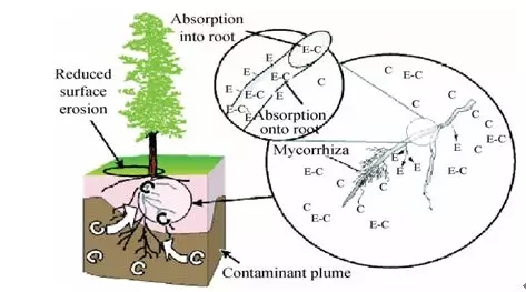 根際降解:根際降解本質(zhì)是植物根部輔助微生物降解。植物根部及其周圍微生物的相互作用,能夠顯著降低石油類污染物的毒性和持久性。首先,植物的非根部分能夠為根部提供必要的營養(yǎng)物質(zhì),促進(jìn)根的生長 ,并分泌有機(jī)物質(zhì),增加石油污染物的生物可利用性;其次,植物根部能夠創(chuàng)造富含糖類、氨基酸、有機(jī)酸、維生素 、單寧、生物堿、固醇、生物酶、生長素等營養(yǎng)物質(zhì)的多元有機(jī)環(huán)境,從而增強(qiáng)周邊微生物群落的新陳代謝活動; 最后,在根際微生物代謝作用下,將石油污染物降解為自身生長必須的碳源,同時減少石油污染物對植物的毒害作用。