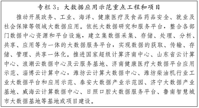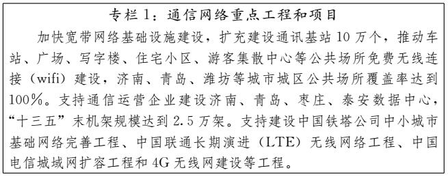 ?。ㄒ唬?qiáng)化項(xiàng)目帶動(dòng),提升產(chǎn)業(yè)規(guī)模組織實(shí)施重大基礎(chǔ)設(shè)施項(xiàng)目。積極推進(jìn)山東半島自主創(chuàng)新示范區(qū)、黃河三角洲國家農(nóng)業(yè)高新技術(shù)產(chǎn)業(yè)示范區(qū)建設(shè)。完善高技術(shù)產(chǎn)業(yè)基地、戰(zhàn)略性新興產(chǎn)業(yè)示范基地的基礎(chǔ)設(shè)施,提高產(chǎn)業(yè)承載能力。規(guī)劃建設(shè)山東省藍(lán)谷區(qū)域創(chuàng)新中心等一批省級區(qū)域創(chuàng)新中心,推進(jìn)區(qū)域創(chuàng)新資源的開放共享,打造形成特色優(yōu)勢顯著的“創(chuàng)新谷”。落實(shí)智慧城市、寬帶山東、大數(shù)據(jù)等重大戰(zhàn)略,推進(jìn)新一代網(wǎng)絡(luò)通訊、大數(shù)據(jù)中心等基礎(chǔ)設(shè)施建設(shè),提升支撐能力。
