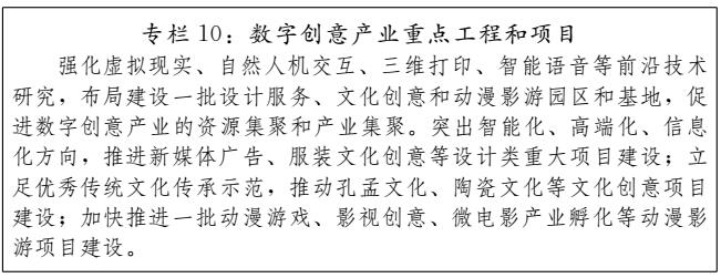 (七)數(shù)字創(chuàng)意產(chǎn)業(yè)。以文化創(chuàng)意、設(shè)計(jì)服務(wù)為核心,引導(dǎo)支持?jǐn)?shù)字創(chuàng)意產(chǎn)業(yè)領(lǐng)域的產(chǎn)品、服務(wù)、技術(shù)、模式、業(yè)態(tài)創(chuàng)新,實(shí)現(xiàn)與相關(guān)產(chǎn)業(yè)融合發(fā)展,著力構(gòu)建文化引領(lǐng)、技術(shù)先進(jìn)、要素齊備、鏈條完整、結(jié)構(gòu)合理、效益良好的數(shù)字創(chuàng)意產(chǎn)業(yè)發(fā)展格局。“十三五”期間,數(shù)字創(chuàng)意產(chǎn)業(yè)產(chǎn)值年均增長25%以上,占GDP比重逐年提高。