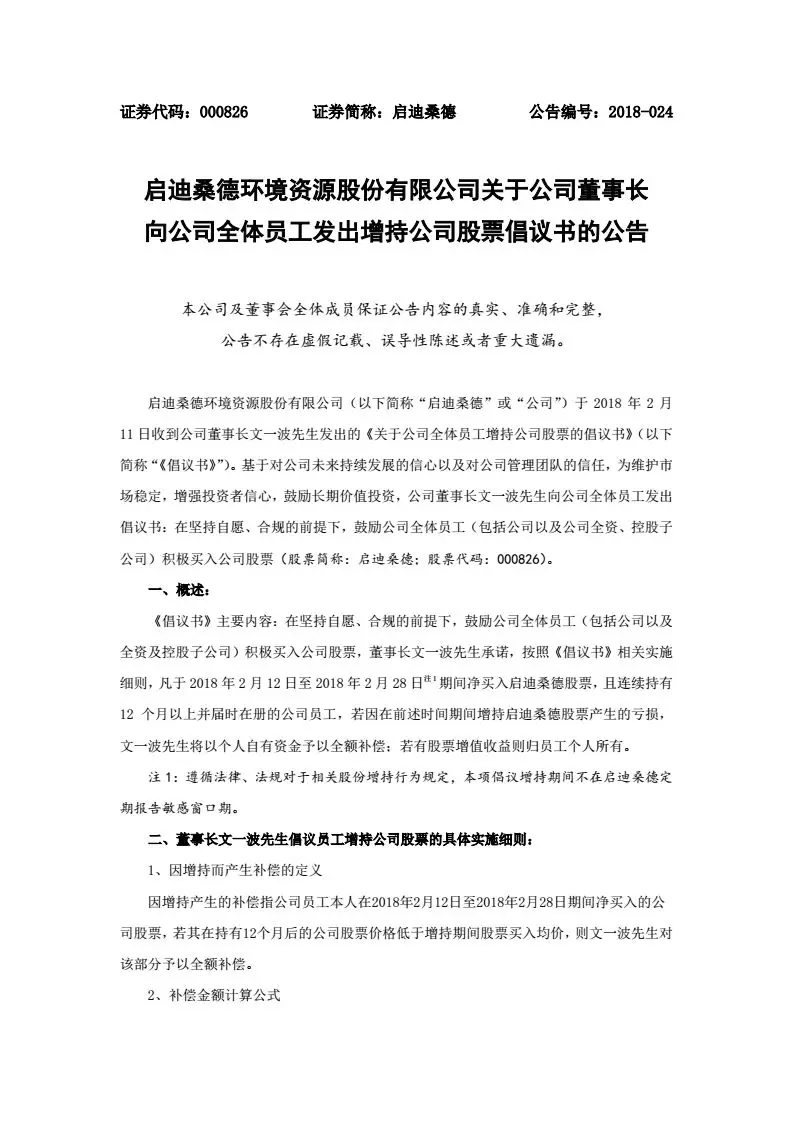 今2月11日,啟迪桑德發(fā)布一則重磅公告,基于對(duì)公司未來(lái)持續(xù)發(fā)展的信心以及對(duì)公司管理團(tuán)隊(duì)的信任,為維護(hù)市場(chǎng)穩(wěn)定,增強(qiáng)投資者信心,鼓勵(lì)長(zhǎng)期價(jià)值投資,文一波董事長(zhǎng)以個(gè)人名義向公司全體員工發(fā)出倡議書。