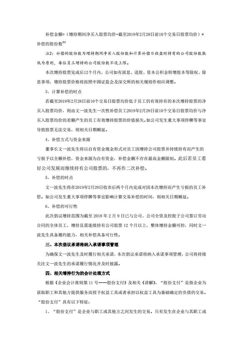 二、補(bǔ)償不設(shè)上限?!岸麻L(zhǎng)文一波先生將以自有資金現(xiàn)金形式對(duì)員工因增持公司股票并持續(xù)持有而產(chǎn)生的虧損予以全額補(bǔ)償,資金來(lái)源為自有資金,補(bǔ)償金額不存在最高金額限制?!睋Q句話說(shuō)就是,虧多少,補(bǔ)多少,你虧,董事長(zhǎng)補(bǔ)!