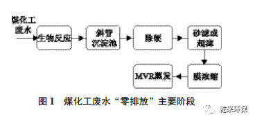 隨著環(huán)保政策的收緊,國家對已建和新建的煤化工項目要求廢水“零排放”。雖然不同煤化工工藝產(chǎn)生的廢水性質有所差異,但傳統(tǒng)處理煤化工廢水的工藝大多包括生物活性處理、化學沉淀、懸浮物過濾、膜濃縮產(chǎn)水回用和蒸發(fā)固化等。圖1 為煤化工廢水“零排放”主要階段示意。