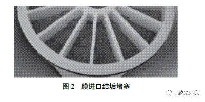 為減少蒸發(fā)量,部分廠家采用RO 膜技術進行濃縮。煤化工廢水TDS濃度約為3 000 mg ˙ L-1,硬度約為300 mg ˙ L-1,COD 約為300 mg ˙L-1。在高濃縮比的工況下,長時間運行會對膜進口和膜面產(chǎn)生污染。因此需投加藥劑除硬,增加了污泥外置費用。卷式RO 膜無法進一步提高濃縮比的主要原因有兩個:第一是卷式RO 膜的進入通道較窄,第二是其膜面剪切力不足。RO 膜進口結垢堵塞情況見圖2。