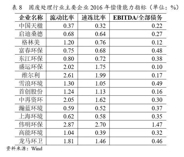 從長(zhǎng)期償債能力指標(biāo)來(lái)看,2016年樣本企業(yè)EBITDA/全部債務(wù)中位數(shù)為0.32倍,其中偉明環(huán)保最高,為1.47倍,主要系其項(xiàng)目運(yùn)營(yíng)業(yè)務(wù)銷售毛利率高導(dǎo)致盈利水平較高、且負(fù)債規(guī)模小所致;2016年樣本企業(yè)EBITDA/利息費(fèi)用的中位數(shù)為7.46倍,行業(yè)長(zhǎng)期償債能力較強(qiáng)。