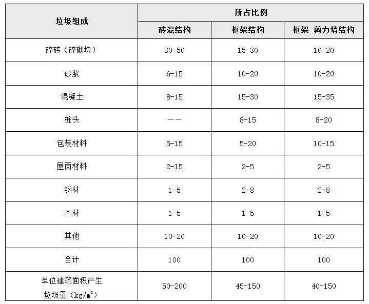 舊建筑物拆除垃圾的組成與建筑物的種類(lèi)有關(guān):廢棄的舊民居建筑中,磚塊、瓦礫、混凝土塊、渣土約占80%,其余為木料、碎玻璃、石灰、金屬、包裝物、防水材料、各類(lèi)電信線和電源線、塑料制品等;廢棄的舊工業(yè)、樓宇建筑中,混凝土塊約占50%~60%,其余為金屬、磚塊、砌塊、塑料制品等。對(duì)不同結(jié)構(gòu)形式的建筑工地,垃圾組成比例略有不同,而垃圾數(shù)量因施工管理情況不同在各工地差異很大。