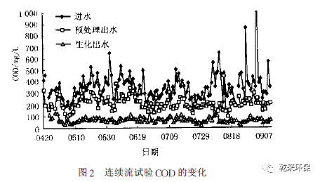 2. 4 連續(xù)流試驗結果和討論:連續(xù)流試驗在上海市某一工業(yè)區(qū)污水處理廠進行。中試研究了催化還原內電解工藝對該工業(yè)區(qū)污水處理廠主要污染成份的降解過程和降解效率,預處理段還原耗材鐵刨花的消耗量及對預處理效果的影響。