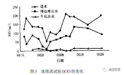 從圖3 可知,生化處理后出水的BOD 也相當平穩(wěn),最大值為12. 5 mg/L,平均值為6. 9 mg/L??偺幚砺蕿?4. 1 % 。