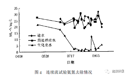 2. 4. 2 氨氮的去除:從圖4 可知,在6 月24 日之前,系統幾乎沒有去除氨氮的效果,且經常出現出水氨氮略高于進水的情況。為了強化硝化效果,24 日起將生化段的停留時間從12H延長至16H 。改變系統后的第一個星期情況沒有什么變化,從7 月2 日開始明顯出現了生物脫氮的跡象,到了7 月10 日,生物脫氮效果明顯,出水氨氮小于5 mg/L。7 月23 日后達到了很好的生物硝化效果。此后氨氮的平均出水濃度只有2. 9 mg/L,去除率達88. 8 % 。